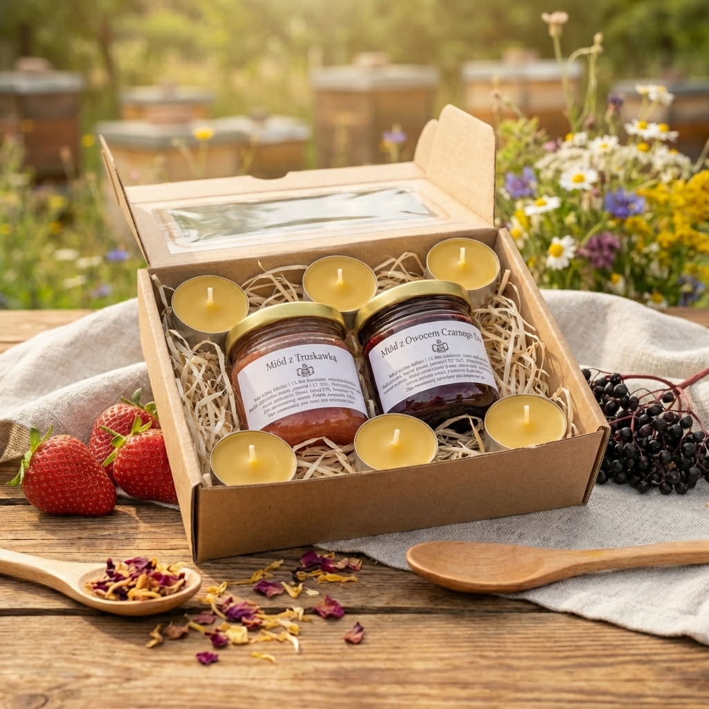 Zestaw mini miodków i świeczek z naturalnego wosku pszczelego zapakowane w ozdobne kartonowe pudełeczko z wstążką. Zestaw zawiera 6 świeczek typu teelight oraz 2 mini miodki o pojemności 50g- smaki miodu do wyboru własnego.